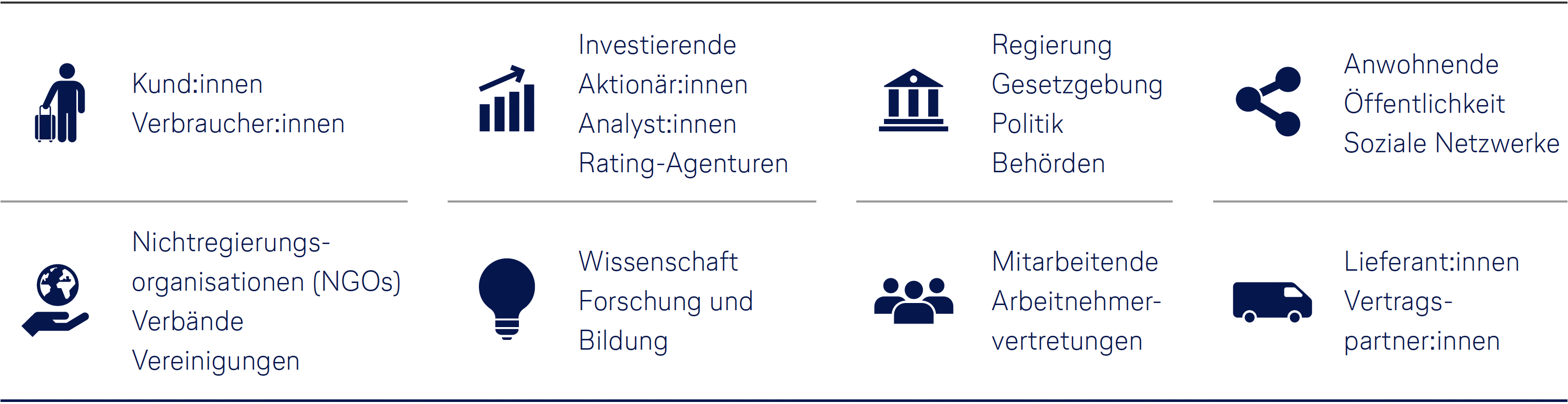 Die Lufthansa Group legt großen Wert auf einen offenen, beständigen und vertrauensvollen Dialog mit ihren internen und externen Interessengruppen und sucht mithilfe vielfältiger Formate aktiv den Austausch mit ihnen. Denn eine verantwortungsvolle Unternehmensführung kann nur im Dialog mit den Stakeholdern des Unternehmens erfolgen. Der kontinuierliche Austausch ermöglicht es der Lufthansa Group, die Bedürfnisse, Erwartungen und Wünsche unterschiedlicher Interessengruppen besser zu verstehen und in ihr unternehmerisches Handeln einzubeziehen. Auch lassen sich so Themen mit potenziellem Einfluss auf langfristige Wertschöpfungsmöglichkeiten besser identifizieren.