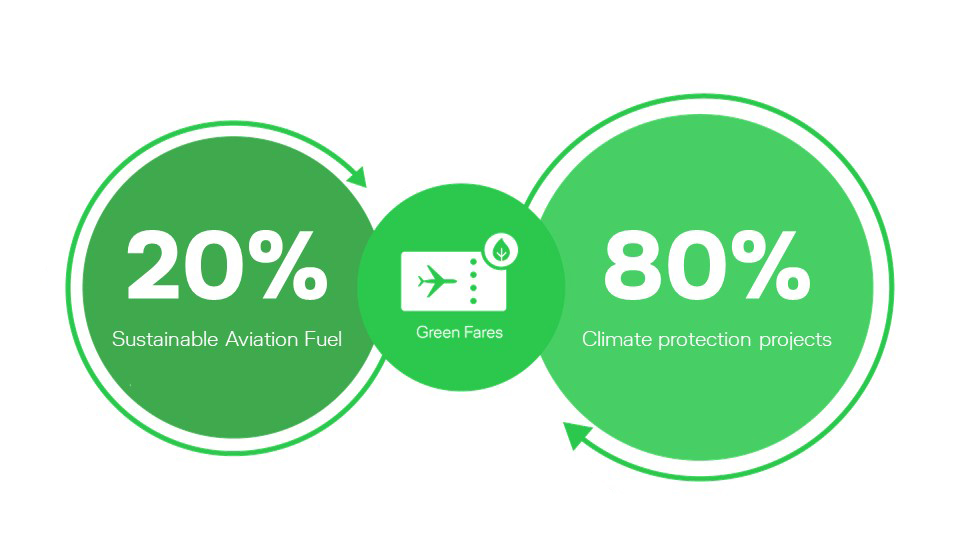 The Green Fares make it possible to fly more sustainably with just one click, as the new fares already include offsetting of flight-related CO₂ emissions. This is achieved by using 20 percent Sustainable Aviation Fuel (SAF) and 80 percent by contributing to high-quality climate protection projects. The Green Fares also offer additional status miles and a free rebooking option.